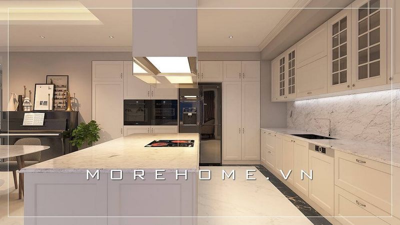 Thiết kế không gian phòng bếp hiện đại sử dụng tone màu trắng nhẹ nhàng, tinh tế và tiện nghi cho người nội trợ
